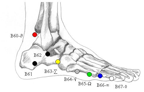 B60; ild-punkt (jing-river)Navn: punktanatomi: ankelknoen associeres med den hellige bjergkæde Kunlun.